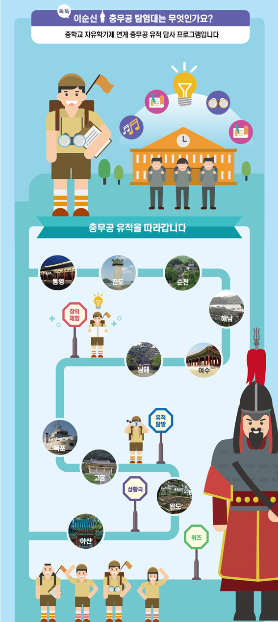 û¼Ò³âµé¿¡°Ô Ãæ¹«°øÀÇ ¸®´õ½Ê°ú ³ª¶ó»ç¶û Á¤½ÅÀ» °¡¸£Ä¡°í ¹®ÈÀ¯»êÀÇ Àǹ̸¦ Àϱú¿ì´Â °è±â¸¦ ¸¶·ÃÇϱâ À§ÇØ ¸¶·ÃµÈ À̹ø ÇÁ·Î±×·¥Àº Ãâ¹ßÁö¿¡ µû¶ó ÁÖÁ¦º°·Î ¡®¼ö·Î·Î °¡´Â ±æ¡¯ ¡®ÁøÇØ·ç ÃâÁ¤ ±æ¡¯ ¡®¿Àµ¿³ª¹« û·Å ±æ¡¯ ¡®¸í·® ½ÂÀü ±æ¡¯ µî 11°¡Áö ÄÚ½º·Î Ž¹æ ·çÆ®°¡ ³ª´µ¾î ÀÖÀ¸¸ç, ¼¿ï¡¤°æ±â, ÃæÃ», Àü¶ó, °æ»ó±Ç µî Âü°¡ ÇлýµéÀÇ Ãâ¹ßÁö¿ª¿¡ µû¶ó 9¿ùºÎÅÍ 11¿ù±îÁö ´çÀÏÄÚ½º¿Í 1¹Ú ÄÚ½º µîÀÌ ´Ù¾çÇÏ°Ô ÁغñµÆ´Ù.