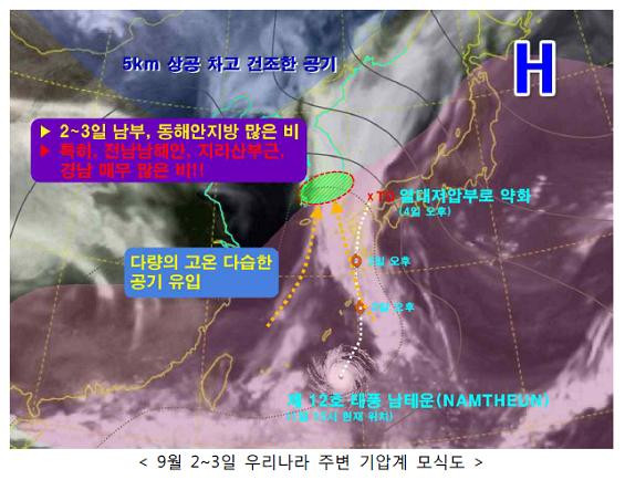 ¿¹»ó °¼ö·®(9¿ù 2~3ÀÏ)Àº Àü³²µ¿ºÎ¡¤°æ»óµµ¡¤Á¦Áֻ갣Àº 50~100mm, °¿ø¿µµ¿¡¤ÃæºÏ¡¤ÀüºÏ¡¤Àü³²¼ºÎ¡¤Á¦ÁÖµµ(»ê°£Á¦¿Ü, 1ÀϺÎÅÍ)´Â 30~80mm, ¼¿ï¡¤°æ±âµµ, °¿ø¿µ¼¡¤Ãæ³²(2ÀÏ)Àº 10~40mm µîÀÌ´Ù.