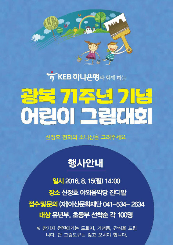 ¾Æ¿ï·¯, KEB ÇϳªÀºÇà°ú ¾Æ»ê¹®ÈÀç´ÜÀº ¾Æ»ê½ÃÀÇ ±â³äÇà»ç¿Í º´ÇàÇÏ¿© ¾Æ»ê½Ã ÃëÇÐ Àü ¾î¸°ÀÌ ¹× ÃʵîÇлýÀ» ´ë»óÀ¸·Î ÆòÈÀÇ ¼Ò³à»ó ±×¸®±â ±×¸²´ëȸ¸¦ °³ÃÖÇÑ´Ù.