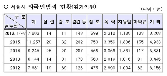 À̳¯ À̸í¼ö ÀÇ¿øÀº ¡°¼¿ï°ÅÁÖ ¿Ü±¹ÀÎ Áֹμö°¡ 2012³â 40¸¸ 6õ296¸í¿¡¼ 2015³â 45¸¸ 7õ806¸íÀ¸·Î 5¸¸¿©¸íÀ̳ª Áõ°¡Çß´Ù.¡±¸é¼ ¡°±×·¯³ª ±×¿¡ µû¸¥ ¿Ü±¹ÀιüÁ˵µ 2012³â 7õ881°Ç¿¡¼ 2015³â 1¸¸ 1õ257°ÇÀ¸·Î ±ÞÁõÇß´Ù.¡±°í ¹àÇû´Ù.