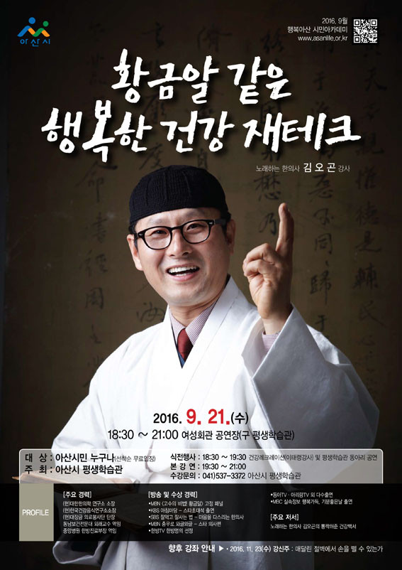 ¾Æ»ê½Ã Æò»ýÇнÀ¹®È¼¾ÅÍ(¼ÒÀå ¹ÎÁ¤ÀÏ)´Â 9¿ù 21ÀÏ ¿ÀÈÄ 7½Ã30ºÐ ¿©¼ºÈ¸°ü °ø¿¬Àå¿¡¼ ³ë·¡ÇÏ´Â ÇÑÀÇ»ç·Î Àß ¾Ë·ÁÁø ±è¿À°ï °»ç¸¦ ÃÊÃ»ÇØ ¡®È²±Ý¾Ë °°Àº ÇູÇÑ °Ç° ÀçÅ×Å©¡¯¶ó´Â ÁÖÁ¦·Î ½Ã¹Î¾ÆÄ«µ¥¹Ì¸¦ °³ÃÖÇÑ´Ù.