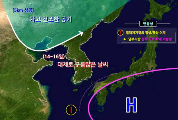 ´ëÀüÁö¹æ±â»óûÀº ƯÈ÷ 14~16ÀÏ ÀϺ» ³²ÂÊÇØ»ó¿¡ À§Ä¡ÇÑ ºÏÅÂÆò¾ç°í±â¾ÐÀÌ ÀϽà ȮÀåÇÒ °ÍÀ¸·Î ¿¹»óµÅ ´ëü·Î Àü±¹ÀÌ ±¸¸§ ¸¹Àº ³¯¾¾¸¦ º¸À̰ÚÀ¸³ª, ³²ÇؾȰú Á¦ÁÖµµ´Â ³²ÂÊ ±â¾Ð°ñÀÇ ¿µÇâÀ¸·Î ºñ°¡ ¿À°Ú°í, ±× ¹ÛÀÇ ³²ºÎÁö¹æÀ¸·Î È®´ëµÉ °¡´É¼ºÀÌ ÀÖ´Ù°í ¹àÇû´Ù.