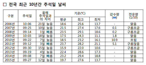 °¢ Áö¿ªº° »ó¼¼³¯¾¾´Â ±â»óû ȨÆäÀÌÁöÀÇ ¡®Ãß¼®¿¬ÈÞ±â»óÁ¤º¸¡¯(http://www.kma.go.kr/weather/special/special_chuseok_01.jsp)¸¦ Âü°íÇÏ¸é µÈ´Ù.