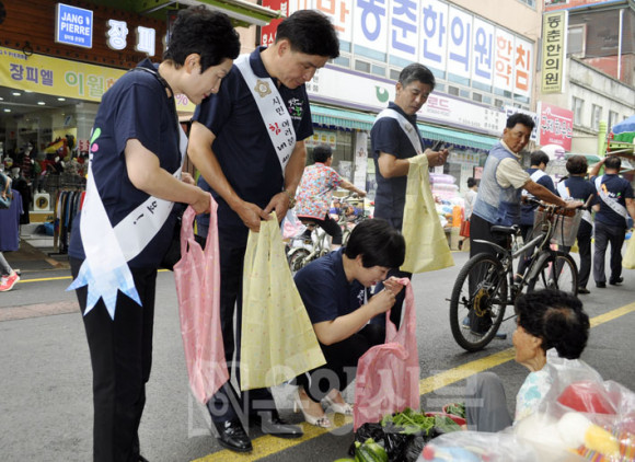Àü±¹Ã¼Àü ±â³äƼ¼ÅÃ÷¸¦ ¸ÂÃç ÀÔ°í ÀüÅë½ÃÀå¿¡ µé¾î¼± ÀÇ¿øµéÀº ¡®¾Æ»ê½Ã¹Î ¿©·¯ºÐ Èû³»¼¼¿ä¡¯¶ó°í ¾´ ¾î±ú¶ì¸¦ µÎ¸£°í, Áö¿ª°æÁ¦ »ì¸®±â À§ÇÑ Àå¹Ù±¸´Ï¸¦ µé°í °ñ¸ñÀ» ´©º³´Ù.