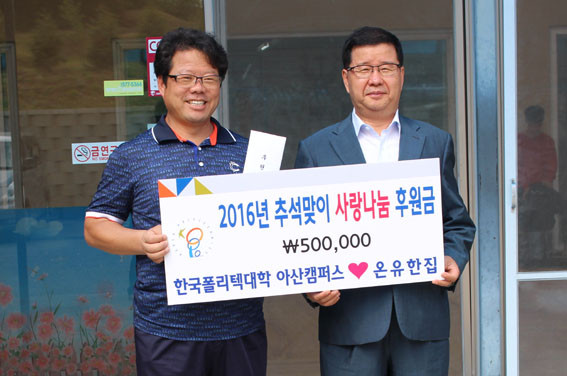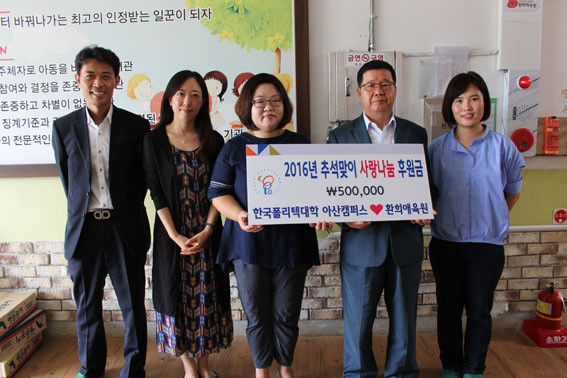 Çѱ¹Æú¸®ÅØ´ëÇÐ ¾Æ»êÄ·ÆÛ½º´Â Àü±³Á÷¿øµéÀÌ 1ÀÎ 1°èÁ »ç¶û³ª´® ÀڸŰῬÀ» ÅëÇØ Áö¼ÓÀûÀÎ »çȸ°øÇåȰµ¿°ú ³ª´® ¹®È Á¤ÂøÀ» À§ÇØ ³ë·ÂÇØ¿Â Ä·ÆÛ½º·Î, ÀڸŠ°á¿¬À» ¸ÎÀº ¾Æ»ê½Ã¿¡ À§Ä¡ÇÑ »çȸº¹Áö¹ýÀÎ ¿ÂÀ¯ÇÑÁý°ú ȯÈñ¾ÖÀ°¿ø¿¡ °¢°¢ 50¸¸ ¿øÀÇ ÈÄ¿ø±ÝÀ» Àü´ÞÇß´Ù.