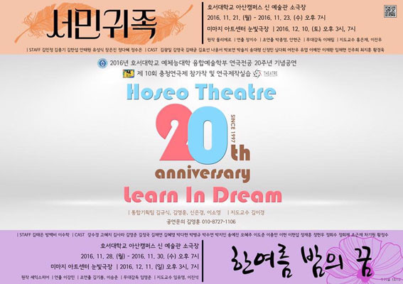 ¡®È£¼´ëÇб³ ¿¹Ã¼´É´ëÇÐ À¶ÇÕ¿¹¼úÇкΠ¿¬±ØÀü°ø 20Áֳ⠱â³ä°ø¿¬¡¯Àº 11¿ù 21ÀÏ~23ÀÏ ¡®¼¹Î±ÍÁ·¡¯ÀÌ, 11¿ù 28ÀÏ~30 ¡®ÇÑ¿©¸§ ¹ãÀÇ ²Þ¡¯ÀÌ °¢°¢ Àú³á 7½Ã, È£¼´ëÇб³ ¾Æ»êÄ·ÆÛ½º ½Å ¿¹¼ú°ü 3Ãþ ¼Ò±ØÀå¿¡¼ °ø¿¬µÈ´Ù.