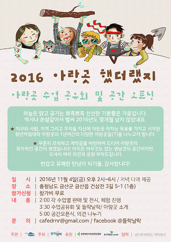 ¾Æ¶û°÷ û³â Ä¿¹Â´ÏƼ °ø°£ ¹× °³¼Ò½Ä¿¡ ´ëÇÑ ÀÚ¼¼ÇÑ »çÇ×Àº https://www.facebook.com/deullaknallak/¸¦ ÅëÇØ ¾Ë ¼ö ÀÖ´Ù.