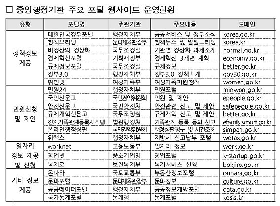 À̸í¼ö ÀÇ¿øÀº ¡°Áß¾ÓÇàÁ¤±â°üµéÀº °¢±â Á¤Ã¥Á¤º¸ Á¦°ø, ¹Î¿ø½Åû µîÀ» À§ÇØ Æ÷ÅлçÀÌÆ®¸¦ ¿î¿µ ÁßÀε¥ 21°³³ª µÇ°í ÀÖ´Ù.¡±¸é¼, ¡°À̵éÀ» ºÐ·ùÇØº¸¸é Á¤Ã¥Á¤º¸ Á¦°ø Æ÷ÅÐ 7°³, ¹Î¿ø½Åû ¹× Á¦¾È Æ÷ÅÐ 7°³, º¹Áö¡¤ÀÏÀÚ¸® Á¤º¸Á¦°ø ¹× ½Åû Æ÷ÅÐ 3°³, ±âŸ 4°³·Î ³ª´²Áö°í ÀÖ´Ù.¡±°í ¹àÇû´Ù.