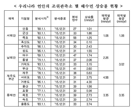 ¿ÃÇØ ¹ßÇ¥ÇÑ ¿ì¸®³ª¶ó ÇØ¼ö¸é »ó½Â·üÀº IPCC(2013)°¡ ¹ßÇ¥ÇÑ Àü ¼¼°è Æò±Õ°ª(2.0mm/yr)º¸´Ù ´Ù¼Ò ³ôÀ¸¸ç, Áö¿ªº°·Î »ó½Â·üÀÌ ´Ù¼Ò Â÷À̸¦ º¸¿´´Ù. °¡Àå »ó½Â·üÀÌ ³ôÀº Áö¿ªÀº Æ÷Ç× ÀÎ±Ù ÇØ¿ªÀ¸·Î 5.98mm/yrÀ̸ç, µÎ ¹øÂ°´Â 38³â °£ ¾à 21cmÀÇ Æò±Õ ÇØ¼ö¸é »ó½Â Ãß¼¼¸¦ º¸ÀÎ Á¦ÁÖ ÀÎ±Ù ÇØ¿ªÀ¸·Î 5.63mm/yr·Î ³ªÅ¸³µ´Ù.