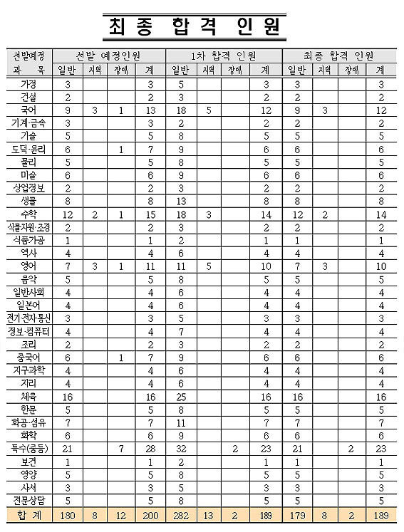 À̹ø ÀÓ¿ë½ÃÇèÀº 33°³ °ú¸ñ 200¸í ¸ðÁý¿¡ 2õ178¸íÀÌ Áö¿øÇØ Á¦1Â÷ ±³À°ÇÐ ¹× Àü°ø, Á¦2Â÷ ¿¹Ã¼´É±³°ú ½Ç±âÆò°¡, ±³¼öÇнÀÁöµµ¾È ÀÛ¼º, ¼ö¾÷½Ç¿¬, ±³Á÷Àû¼º ½ÉÃþ¸éÁ¢ Æò°¡¸¦ °ÅÃÄ 189¸íÀ» ÃÖÁ¾ ÇÕ°ÝÀÚ·Î ¼±Á¤Çß´Ù.