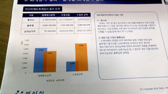 ¾Æ»ê½Ã¹Î¿¬´ë´Â ¡°¾Æ»ê¿©°´ ¶ÇÇÑ ¾÷ü°¡ Á¦½ÃÇÑ ¼øÀڻ갡ġ´Â 7¾ï 5õ142¸¸ 5õ626¿øÀ̾úÁö¸¸ ¼öÁ¤ÈÄ ±Ý¾×Àº 3¾ï 9õ112¸¸ 1õ379¿øÀ¸·Î È®Á¤µÊÀ¸·Î½á, °è¼Ó ±â¾÷À¸·Î¼ÀÇ Á¸¼Ó°¡´É¼ºÀÌ ºÒÈ®½ÇÇÑ »óÅÂÀÓÀ¸·Î µå·¯³µ´Ù¡±°í ÁöÀûÇß´Ù.