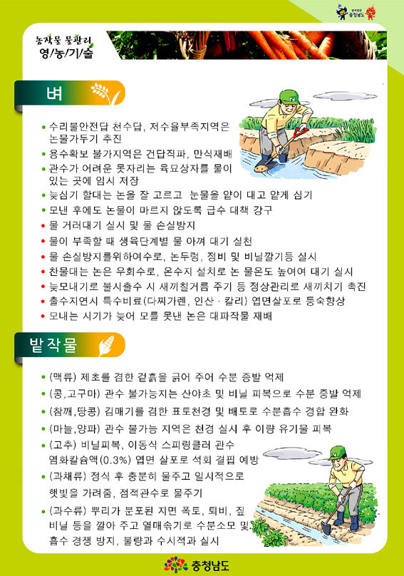 Ãæ³²µµ°¡ Æò³âº¸´Ù ³·Àº Àú¼öÀ²°ú °¿ì·®À¸·Î º½Ã¶ ³ó¾÷¿ë¼ö ºÎÁ·ÀÌ ¿¹»óµÊ¿¡ µû¶ó ³óÀÛ¹° ÇÇÇØ¸¦ ÃÖ¼ÒÈÇϱâ À§ÇÑ ¼±Á¦Àû ´ëÀÀ¿¡ ³ª¼±´Ù.