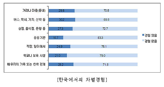 Á¶»ç°á°ú¿¡ µû¸£¸é, °áÈ¥ÀÌÁÖ¿©¼º º»ÀÎÀÇ Â÷º°°æÇèÀº `°Å¸®³ª ¸¶À»¿¡¼¡¯°¡ 29.5%, `´ëÁß±³ÅëÀ» ÀÌ¿ë ½Ã¡¯ 30.2%, `»óÁ¡, À½½ÄÁ¡ µî¡¯ 27.3%, `°ø°ø±â°ü¡¯ 16.7%, `Á÷Àå ¹× ÀÏÅÍ¿¡¼¡¯ 24.9%, `Çб³³ª º¸À°½Ã¼³¿¡¼¡¯ 21.0%, `¹è¿ìÀÚÀÇ °¡Á· ¶Ç´Â ģô°ü°è¿¡¼¡¯ 28.2%ÀÎ °ÍÀ¸·Î ³ªÅ¸³µ´Ù.