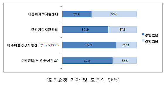 | | ¨Ï ¿Â¾ç½Å¹® | | Ãæ³² °áÈ¥ÀÌÁÖ¿©¼ºµéÀÌ Çѱ¹¿¡¼ÀÇ Â÷º°°æÇè ½Ã µµ¿òÀ» ¿äûÇÑ ±â°üÀ¸·Î´Â ´Ù¹®È°¡Á·Áö¿ø¼¾ÅͰ¡ 60.6%·Î °¡Àå ³ô¾ÒÀ¸¸ç, °Ç°°¡Á¤Áö¿ø¼¾ÅÍ 37.8%, ÀÌÁÖ¿©¼º±ä±ÞÁö¿ø¼¾ÅÍ 27.1%, Áֹμ¾ÅÍ 32.5%ÀÎ °ÍÀ¸·Î ³ªÅ¸³µ´Ù.