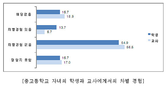 | | ¨Ï ¿Â¾ç½Å¹® | | Áß°íµîÇлý ÀÚ³àÀÇ °æ¿ì, Çлýµé °£ÀÇ Â÷º°°æÇèÀÌ ÀÖ¾ú´Ù´Â ÀÀ´äÀº ÀüüÀÇ 13.7%, ±³»ç¿¡°Ô¼ Â÷º°°æÇèÀÌ ÀÖ¾ú´Ù´Â ÀÀ´äÀº 5.7%ÀÎ °ÍÀ¸·Î ³ªÅ¸³ª ÃʵîÇлý º¸´Ù ³·Àº ÆíÀÌ´Ù.