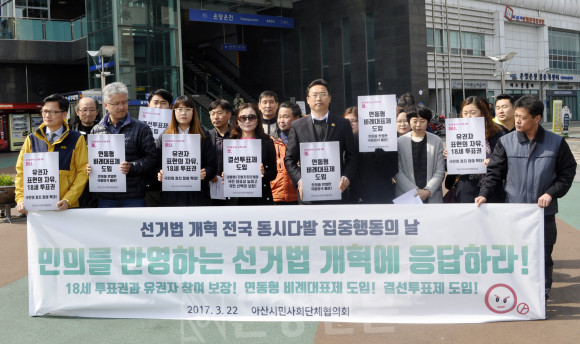 ¾Æ»ê½Ã¹Î»çȸ´ÜüÇùÀÇȸ´Â ¡°¿À´Ã(22ÀÏ) Àü±¹ÀûÀ¸·Î ¼±°Å¹ý °³ÇõÀ» À§ÇÑ µ¿½ÃÇൿÀÌ ¹ú¾îÁø´Ù. ¿ì¸®´Â ¾Æ»êÁö¿ª ½Ã¹Îµé¿¡°Ô ¾Ë¸®°í, Áö¿ªÀÇ ´Ù¾çÇÑ ÁÖüµéÀÌ ÀÌ ¿îµ¿¿¡ Âü¿©ÇÒ ¼ö ÀÖµµ·Ï ³ë·ÂÇÒ °ÍÀÌ´Ù. Áö¿ª¿¡¼ Ãâ¹ßÇÏ´Â ±¤¹üÀ§ÇÑ ¿¬´ë¸¦ ¸¸µé¾î ¹Ýµå½Ã ¼±°Å¹ý °³ÇõÀ» ÀïÃëÇØ³¾ °ÍÀÌ´Ù¡±¸ç ³»³â Áö¹æ¼±°Å ÀÌÀü¿¡ ¼±°ÅÁ¦µµ¸¦ °³ÇõÇØ Áö¿ªÁ¤Ä¡¿¡¼ºÎÅÍ º¯È°¡ ÀϾ ¼ö ÀÖµµ·Ï ÇÒ °ÍÀ̶ó°í °Á¶Çß´Ù.