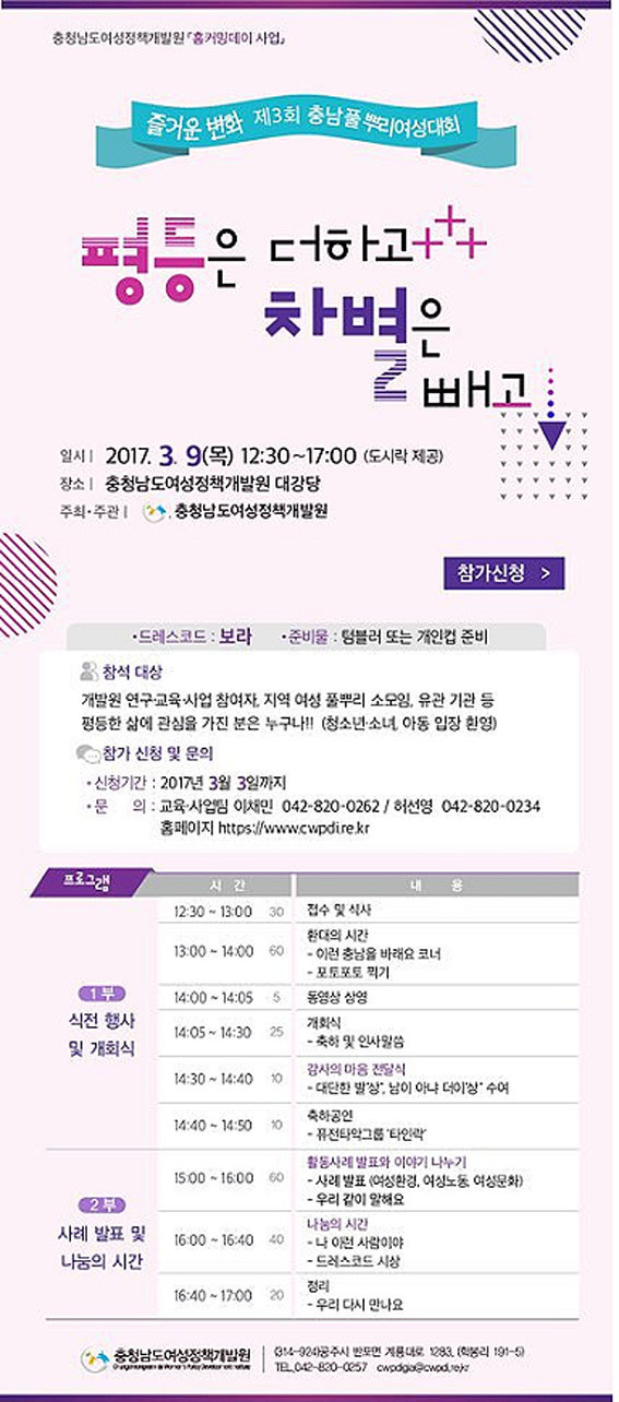 ƯÈ÷ ¿ÃÇØ ÃæÃ»³²µµ´Â ¡®Ãæ³²¾ç¼ºÆòµîºñÀü 2030¡¯ ÃßÁøÀ» À§ÇÑ ¼¼ºÎ ½ÇÇà °èȹÀ» ¼ö¸³ÇÏ°í ±× ½ÇÇà¿¡ ¹ÚÂ÷¸¦ °¡Çϰí ÀÖ´Ù. À̹ø ´ëȸ¸¦ ÅëÇØ ºñÀü ¼ö¸³°úÁ¤¿¡ ÇÔ²² Âü¿©Çϰí Å« ÈûÀ» ½Ç¾îÁØ Ç®»Ñ¸® ¿©¼º Ȱµ¿°¡µé, µ¿¹ÝÀÚ·Î ÇÔ²² °É¾î¿Â Áö¿ª ¿©¼ºµé¿¡°Ô °¨»çÀÇ ¸¶À½µµ Àü´ÞÇÒ ¿¹Á¤ÀÌ´Ù.