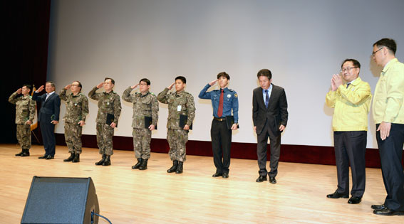 µµ³» 15¸¸ ¿¹ºñ±ºµéÀÇ »ç¸í°¨°ú ÀÚ±à½ÉÀ» °íÃëÇÏ°í ¹Î¡¤°ü¡¤±º¡¤°æ ÅëÇÕ¹æÀ§Ã¼Á¦¸¦ ±¸ÃàÇϱâ À§ÇØ ¿¬ À̳¯ ±â³ä½Ä¿¡´Â ³²±Ã¿µ ÇàÁ¤ºÎÁö»ç, µµ¿Í ½Ã¡¤±º ÅëÇÕ¹æÀ§ÇùÀÇȸ À§¿ø, Çö¿ª ¹× ¿¹ºñ±º ÁöÈÖ°ü µî 500¿©¸íÀÌ Âü°¡Çß´Ù.