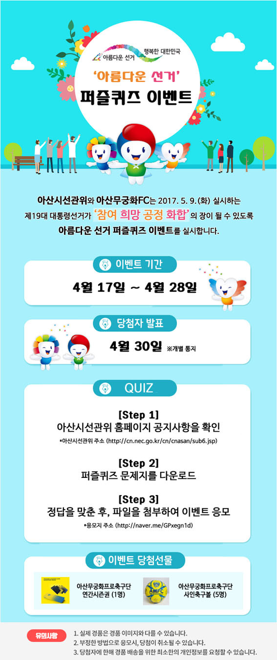 ¡®¾Æ¸§´Ù¿î ¼±°Å¡¯ ÆÛÁñÄûÁîÀÇ ÁÖÁ¦´Â Á¦19´ë ´ëÅë·É¼±°Å¡¤¾Æ»ê¹«±ÃÈFC¡¤¾Æ»ê½Ã Áö¿ª¿¡ °üÇÑ ³»¿ëµé·Î ±¸¼ºµÅ ÀÖÀ¸¸ç, ÄûÁîÀÇ Á¤´äÀ» ¸ÂÃá ÀÀ¸ðÀÚµé °¡¿îµ¥ ÃßÃ·ÇØ ¾Æ»ê¹«±ÃÈFCÀÇ ¿¬°£½ÃÁð±Ç, »çÀκ¼ µîÀÇ ½Ã»óǰÀ» ÁõÁ¤ÇÒ ¿¹Á¤ÀÌ´Ù.