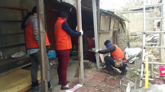 ºÀ»ç¿¡ Âü¿©ÇÑ ÇູŰ¿òÃßÁø´Ü¿ø 5¿©¸í°ú °ø»ç¾÷ü °ü°èÀÚ´Â ³°Àº ºñ´Ò·Î ¸·¾Æ³õ¾Ò´ø ºÎºÐÀ» Á¦°ÅÇÏ°í ºÒÅõ¸íÇÏ°í ´Ü´ÜÇÑ Â÷¾çÀ» »õ·Î ¼³Ä¡ÇßÀ¸¸ç Áý ÀÔ±¸ ÁøÀԷεµ ¾î¸£½ÅÀÌ ³Ñ¾îÁöÁö ¾Êµµ·Ï ¹Ì²ô·³¹æÁö °ø»ç¸¦ ½Ç½ÃÇß´Ù.