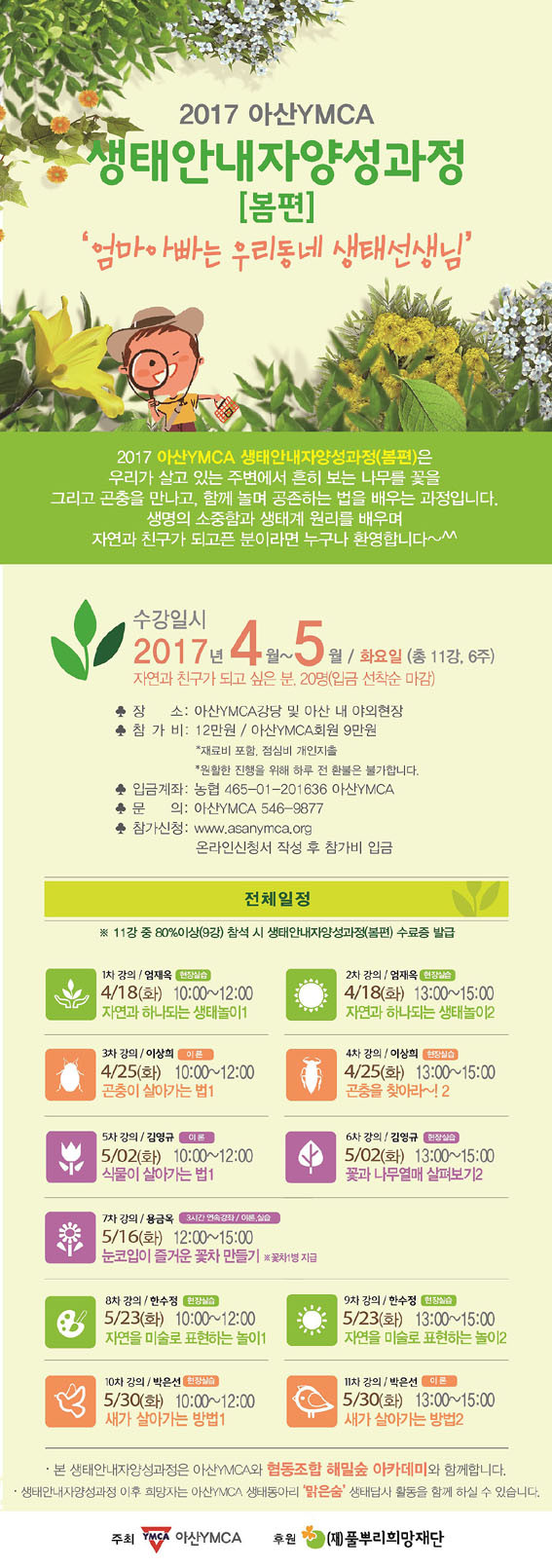 ¾Æ»êYMCA´Â ¡®2017 ¾Æ»êYMCA »ýžȳ»Àھ缺°úÁ¤(º½Æí)¡¯À» ÅëÇØ ¿ì¸®°¡ »ì°í ÀÖ´Â ÁÖº¯¿¡¼ ÈçÈ÷ º¸´Â ³ª¹«¸¦ ²ÉÀ» ±×¸®°í °ïÃæÀ» ¸¸³ª°í, ÇÔ²² ³î¸ç °øÁ¸ÇÏ´Â ¹ýÀ» ¹è¿ì´Â °úÁ¤À¸·Î, »ý¸íÀÇ ¼ÒÁßÇÔ°ú »ýÅÂ°è ¿ø¸®¸¦ ÀÌÇØÇÏ°í ³ª´©´Â »ýžȳ»ÀÚ¸¦ ¾ç¼ºÇÑ´Ù°í ¹àÇû´Ù.