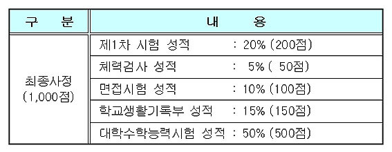 ù °ü¹®ÀÎ 1Â÷½ÃÇè¿¡¼´Â ±¹¾î, ¿µ¾î, ¼öÇÐ 3°ú¸ñÀÇ ¼ºÀûÀ¸·Î ÀüÇüº° ¸ðÁýÀοøÀÇ 4¹è¼ö¸¦ ¼±¹ßÇϰí, 2Â÷½ÃÇè¿¡¼´Â °Ç°ÇÑ ½Åü¿Í ¿Ã¹Ù¸¥ Àμº, Àû°Ý¼º µîÀÇ È®ÀÎÀ» À§ÇÏ¿© ½Åü°Ë»ç, ü·Â°Ë»ç, ÀΡ¤Àû¼º°Ë»ç, ¸éÁ¢ µîÀ» ½Ç½ÃÇϸç, ÃÖÁ¾»çÁ¤¿¡¼´Â 1, 2Â÷½ÃÇè ¼ºÀû¿¡ ¼öÇдɷ½ÃÇè, Çб³»ýȰ±â·ÏºÎ Á¡¼ö µîÀ» ÇÕ»êÇÏ¿© ÃÖÁ¾ÇÕ°ÝÀÚ¸¦ °áÁ¤ÇÑ´Ù.
