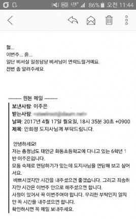 Áö³ 4¿ù 17ÀÏ ¿ÀÈÄ ¾ÈÈñÁ¤ Ãæ³²µµÁö»ç¿¡°Ô ´çµ¹(?)ÇÑ ³»¿ëÀÇ À̸ÞÀÏ ÇÑ ÅëÀÌ ºÒ¾¦ µµÂøÇß´Ù. ÅÂ¾È Èµ¿ÃÊ 6Çгâ 1¹Ý(´ãÀÓ±³»ç À̼ºÀç) ÀÌÁÖÀº ÇлýÀÌ ±¹¾î ±³°ú ¡®¸é´ã¡¯ ´Ü¿ø ¡®¸ðµÒ¡¯ ¼÷Á¦ ÇØ°áÀ» À§ÇØ ¾È Áö»ç¿¡°Ô ¸é´ãÀ» ¿äûÇÑ °ÍÀε¥, ¡°À̹ø ÁÖ ¾ÈÀ¸·Î ÇØÁÖ¼ÌÀ¸¸é ÇÑ´Ù¡±¸ç ¡®µ¥µå¶óÀΡ¯±îÁö ¼³Á¤Çß´Ù.