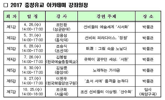 (Àç)Ãæ³²¿ª»ç¹®È¿¬±¸¿ø(¿øÀå ÀåÈ£¼ö)Àº 2014³âºÎÅÍ ¸Å³â ÃæÇö¼¿ø Ȱ¿ë»ç¾÷ÀÇ ÀÏȯÀ¸·Î ÃæÃ»À¯±³ ¾ÆÄ«µ¥¹Ì¸¦ ÁøÇàÇØ ¿Ô´Ù. ¿ÃÇØ´Â ¸Å¿ù ¸¶Áö¸· ¼ö¿äÀÏ ¡®¹®È°¡ ÀÖ´Â ³¯¡¯ Ưº° ÇÁ·Î±×·¥À¸·Î ¡®Á¶¼± ¼±ºñµéÀÇ ¿¹¼ú¼¼°è¡¯¶ó´Â Å« ÁÖÁ¦·Î °Á¸¦ ±âȹÇÏ¿´´Ù. ¿¾ »ç¶÷µéÀÇ »î°ú »ý°¢, ±×¸®°í ¹ÌÇÐÀ» ½Ã¡¤¼¡¤È, Á¤¿ø ¹× ¼¿ø °ø°£, À½¾Ç µîÀ» ÅëÇØ¼ À½¹ÌÇØ º¼ ¼ö ÀÖµµ·Ï °Á¸¦ ±¸¼ºÇÏ¿´´Ù.