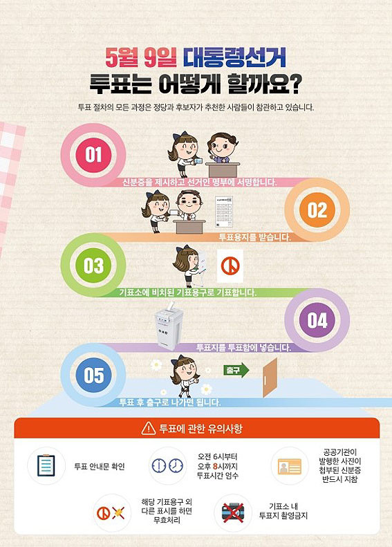 ÅõÇ¥´Â º»ÀÎ È®ÀÎ °úÁ¤À» °ÅÄ¡´Â °ÍÀ¸·Î ½ÃÀ۵ȴÙ. À¯±ÇÀÚ´Â ÅõÇ¥»ç¹«¿ø¿¡°Ô ½ÅºÐÁõÀ» Á¦½ÃÇÏ°í ¼±°ÅÀθíºÎ¿¡ ¼¸íÇÑ µÚ, ÅõÇ¥¿ëÁö¸¦ ¹Þ¾Æ ±âÇ¥¼Ò¿¡ µé¾î°¡°Ô µÈ´Ù. À̶§, ±âÇ¥¿ë±¸´Â ¹Ýµå½Ã ±âÇ¥¼Ò¿¡ ºñÄ¡µÈ Á¤±ÔÀÇ ±âÇ¥¿ë±¸¸¦ »ç¿ëÇØ¾ß Çϸç, ±âÇ¥ÇÑ ÅõÇ¥Áö¸¦ ÅõÇ¥ÇÔ¿¡ ÅõÀÔÇÔÀ¸·Î¼ ÅõÇ¥ °úÁ¤Àº Á¾·áµÈ´Ù.