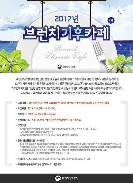 ´ëÀüÁö¹æ±â»óû(ûÀå ¼Àå¿ø)Àº ÃÖ±Ù ¹®È Æ®·»µåÀÎ ºê·±Ä¡(Brunch)¸¦ ±âÈĺ¯È ÀÌÇØ È®»êÀÇ ÀåÀ¸·Î Ȱ¿ëÇØ ±âÈĺ¯È°úÇÐÀ» »ýȰ ¼ÓÀ¸·Î È®»êÇϰíÀÚ ¡®ºê·±Ä¡ ±âÈÄ Ä«Æä 3±â¡¯¸¦ ¿î¿µÇÑ´Ù.