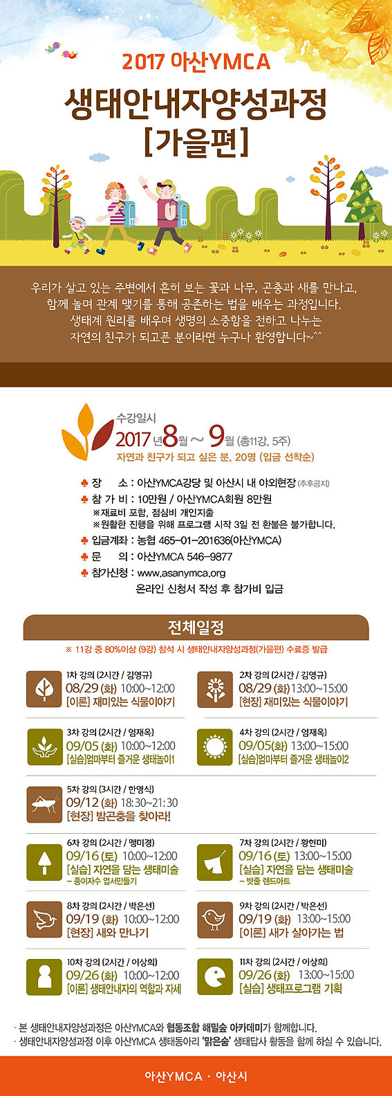 ¾Æ»ê½Ã°¡ ÁÖÃÖÇϰí, ¾Æ»êYMCA°¡ ÁÖ°üÇÏ´Â º» °úÁ¤ÀÇ Âü°¡½ÅûÀº ¾Æ»êYMCA ȨÆäÀÌÁö(www.asanymca.org)¿¡¼ °¡´ÉÇÏ¸ç ¹®ÀÇ´Â ¾Æ»êYMCA(546-9877)·Î ÇÏ¸é µÈ´Ù.
