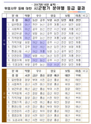 Ãæ³²µµ°¡ µµ³» 15°³ ½Ã¡¤±ºÀ» ´ë»óÀ¸·Î Áö³ÇØ ¼öÇàÇÑ À§Àӻ繫¿¡ ´ëÇÑ ¼öÇàÆò°¡¸¦ ½Ç½ÃÇÑ °á°ú, ¾Æ»ê½Ã¿Í ¼Ãµ±ºÀÌ ½Ã(ã¼)ºÎ¿Í ±º(ÏÛ)ºÎ¿¡¼ °¢°¢ 1À§¸¦ Â÷ÁöÇß´Ù.