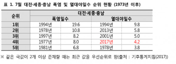 7¿ù ´ëÀü¡¤¼¼Á¾¡¤Ãæ³²ÀÇ Æò±Õ Æø¿°Àϼö´Â 2.4ÀÏ(Æò³â 3.2ÀÏ)·Î 1973³â ÀÌÈÄ ³× ¹øÂ°·Î ¸¹¾ÒÀ¸¸ç ³»·úÀ» Áß½ÉÀ¸·Î Æø¿°ÀÌ ºó¹øÈ÷ ¹ß»ýÇß´Ù.