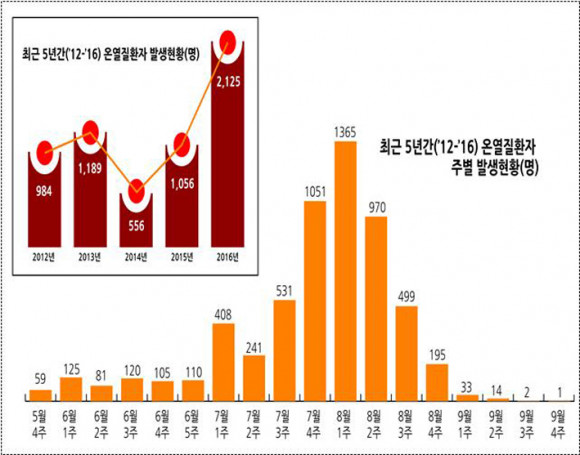 µµ¿¡ µû¸£¸é, Áö³ 2012³âºÎÅÍ 5³â°£ ¹ß»ýÇÑ ¿Â¿ÁúȯÀÚ 346¸í °¡¿îµ¥ Æø¿°Àϼö°¡ Áõ°¡ÇÏ´Â 8¿ù 1¢¦2ÁÖ »çÀÌ È¯ÀÚ°¡ ÀüüÀÇ 39.5%(**¸í)·Î °¡Àå ¸¹Àº °ÍÀ¸·Î Áý°èµÆ´Ù.