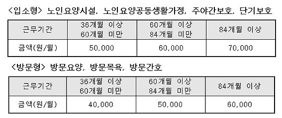 ¡ãÁö±Þ´ë»óÀº ±Ù¼Ó±â°£°ú ¼ºñ½º Áú °£ »ó°ü°ü°è°¡ »ó´ëÀûÀ¸·Î Å« ¿ä¾çº¸È£»ç¡¤»çȸº¹Áö»ç¡¤°£È£(Á¶¹«)»ç¡¤¹°¸®(ÀÛ¾÷)Ä¡·á»ç µî ¾î¸£½Å¿¡°Ô Á÷Á¢¼ºñ½º¸¦ Á¦°øÇÏ´Â Á÷Á¾À» ´ë»óÀ¸·Î Áö±Þ(¾à 4¸¸ 7õ¸í)ÇÏ¸ç ¡ãÀå±â±Ù¼Ó »êÁ¤±âÁØÀº ÀÔ¼ÒÇü°ú ¹æ¹®ÇüÀ¸·Î ±¸ºÐÇØ »êÁ¤Çϸç, ÀÔ¼ÒÇüÀº ÃÖ±Ù ¿ù 120½Ã°£ ÀÌ»ó °è¼Ó ±Ù·ÎÇÑ ±â°£ÀÌ 36°³¿ù ÀÌ»ó, ¹æ¹®ÇüÀº ÃÖ±Ù 4³â°£ ¿ù 60½Ã°£ ÀÌ»ó ±Ù·ÎÇÑ ±â°£ÀÌ 36°³¿ù ÀÌ»óÀÎ Á¾»çÀÚ¿¡°Ô Áö±ÞÇÑ´Ù.