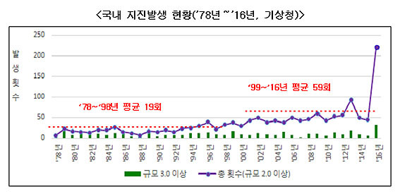 Áö³ 2016³â 9¿ù 12ÀÏ °æÁÖ¿¡¼´Â ±¹³» ÁöÁø °üÃø ÀÌ·¡ ÃÖ´ë ±Ô¸ð(5.8)ÀÇ ÁöÁøÀÌ ¹ß»ýÇßÀ¸¸ç ¿©Áø(±Ô¸ð 1.5 ÀÌ»ó) ¸¸µµ ÁöÁø ÀÌÈÄ °°Àº ÇØ 12¿ù 27ÀϱîÁö ÃÑ 556ȸ³ª ¹ß»ýÇß´Ù.
