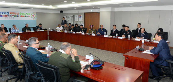 ¾ÈÈñÁ¤ Áö»ç´Â 10¿ù 30ÀÏ ±¹¹æ´ë ¾Èº¸°úÁ¤¿¡¼ ±³À°¹Þ°í ÀÖ´Â ¿Ü±¹±º °íÀ§ Àå±³ 21¸íÀ» ÃÊû, ´ëȸ¦ ³ª´©¸ç Ãæ³²À» ¼Ò°³Çϰí Ÿ±¹¿¡¼ÀÇ ³ë°í¸¦ °Ý·ÁÇß´Ù.