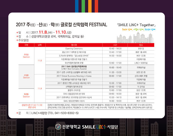 ÁÖ¹Î, ±â¾÷, ´ëÇÐÀÌ Âü¿©ÇÏ¸ç ¼±¹®´ë¿¡¼ ÁøÇàµÈ´Ù. ù° ³¯ÀÎ 8ÀÏ¿¡´Â ¡®Ãæ³² 2017 ´ëÇлý Àâ Æä½ºÆ¼¹ú¡¯°ú ¡®2017 SMU ±Û·Î¹ú »êÇÐÇù·Â Æ÷·³¡¯À» ÁøÇàÇÑ´Ù.