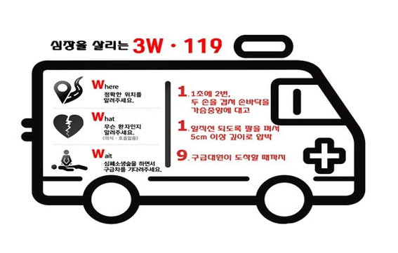¿©±â¼ 119´Â ¡®(1)ÃÊ¿¡ 2¹ø ¼Õ¹Ù´ÚÀ» °¡½¿ Áß¾Ó¿¡ ´ë°í (1)ÀÏÁ÷¼±ÀÌ µÇµµ·Ï ÆÈÀ» Æì °¡½¿À» ¾Ð¹ÚÇϰí (9)±¸±Þ´ë°¡ µµÂøÇÒ ¶§°¡Áö ½ÉÆó¼Ò»ý¼úÀ» ½Ç½ÃÇØ ´Þ¶ó¡¯´Â Àǹ̴Ù.