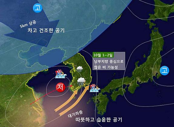 ³¯¾¾ Àü¸ÁÀ» º¸¸é 9¿ù 30ÀÏ¿¡´Â °í±â¾ÐÀÇ ¿µÇâÀ¸·Î ´ëÀü¡¤¼¼Á¾¡¤Ãæ³²Áö¹æÀº ´ëü·Î ¸¼°ÚÀ¸³ª 10¿ù 1ÀÏÀº ¼ÂÊ¿¡¼ ´Ù°¡¿À´Â Àú±â¾ÐÀÇ ¿µÇâÀ¸·Î ³·¿¡ ¼ÂÊ Áö¿ªºÎÅÍ ºñ°¡ ½ÃÀ۵Š¹ã¿¡ ´ëºÎºÐ Áö¿ªÀ¸·Î È®´ëµÇ°Ú°í, 2ÀÏ ³·¿¡ ´ëºÎºÐ ±×Ä¡°Ú´Ù°í Àü¸ÁÇß´Ù.