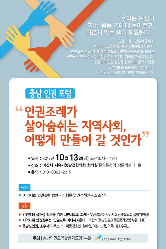 ¡®ºÎ¶ã¡¯Àº ¡°µ¿¼º¾Ö¸¦ Á¶ÀåÇÑ´Ù´Â ºñ³í¸®Àû ÁÖÀåÀ» ÆîÄ¡°í ÀÖ´Â ÀϺΠ¹Ý´ë·ÐÀÚµé·Î ÀÎÇØ ÇöÀç Ãæ³²µµ ÀαÇÁ¶·Ê°¡ Á¸ÆóÀÇ À§±â¿¡ Ã³ÇØÀÖ´Â °¡¿îµ¥, À̹ø Åä·Ðȸ´Â ÀαÇÀÇ °¡Ä¡¸¦ Áö¿ª»çȸ¿¡ »Ñ¸® ³»¸®±â À§ÇÑ °¢°è °¢ÃþÀÇ ´Ù¾çÇÑ ¸ñ¼Ò¸®¸¦ ´ã¾Æ³»°íÀÚ ÇÑ´Ù¡±¸é¼ ¡°ÀαÇÀÇ ½ÇÇöÀ» À§ÇÑ Áö¹æÁ¤ºÎÀÇ °úÁ¦ ¹× ½Ã¹Î»çȸÀÇ ¿ªÇÒ, ÀαDZ³À° ¹æ¾Èµî¿¡ ´ëÇÑ Àü¹®°¡µéÀÇ ¹ßÁ¦¿Í ¼º¼Ò¼öÀÚ, û¼Ò³â, Àå¾ÖÀÎµî »çȸÀû ¼Ò¼öÀÚµéÀÇ »ý»ýÇÑ À̾߱⸦ µéÀ» ¼ö ÀÖ´Â ½Ã°£À» ¸¶·ÃÇß´Ù¡±°í ¹àÇû´Ù.