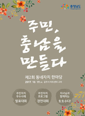 Ãæ³²µµ´Â ¿À´Â 10¿ù 19ÀÏ °øÁÖ °í¸¶¾ÆÆ®¼¾ÅÍ¿¡¼ ¡®ÁÖ¹Î, Ãæ³²À» ¸¸µé´Ù!¡¯¸¦ ÁÖÁ¦·Î ¡®Á¦2ȸ µ¿³×ÀÚÄ¡ ÇѸ¶´ç¡¯À» °³ÃÖÇÑ´Ù°í ¹àÇû´Ù.