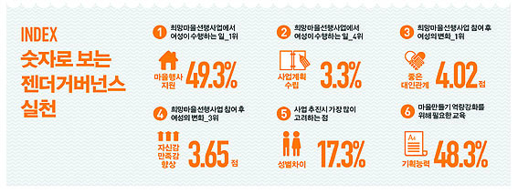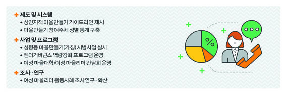 - ¡®¼ºÆòµî ¸¶À»¸¸µé±â¡¯(°¡Äª) ½Ã¹ü»ç¾÷ ½Ç½Ã: ³óÃÌÁö¿ª ¸¶À»¸¸µé±â¿¡ ÀÖ¾î Á¨´õ°Å¹ö³Í½º°¡ ½ÇõµÉ ¼ö ÀÖ´Â »ç¾÷¸ðµ¨À» ¸¶·ÃÇÔ. ¸¶À»¸¸µé±â Àü¹®°¡¿Í Á¨´õ Àü¹®°¡°¡ »ç¾÷ Ãʱâ´Ü°èºÎÅÍ ÅõÀÔµÇ¾î ¸¶À»¸¸µé±â ¼ºÀÎÁö °¡À̵å¶óÀÎÀ» Àû¿ëÇÏ¸é¼ ½Ã¹ü»ç¾÷À» ÃßÁøÇÏ°í ¼º°úºÐ¼®À» ÅëÇØ ¸ðµ¨À» È®»êÇÔ