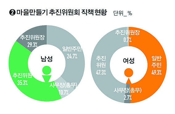 ¼³¹®Á¶»ç ´ë»óÀÚ Áß ³²¼ºÀº ÃßÁøÀ§¿øÀåÀÌ 29.3%, ÃßÁøÀ§¿ø 35.3%°¡ Âü¿©ÇÑ ¹Ý¸é, ¿©¼ºÀº ÃßÁøÀ§¿øÀÌ 47.3%À̸ç ÃßÁøÀ§¿øÀåÀº 0.7%¿¡ ºÒ°úÇÑ °ÍÀ¸·Î ³ªÅ¸³ª, ±âÁ¸ ¸¶À» ³» Á÷Ã¥ÀÇ ¼ºº° ´ëÇ¥¼º ºÐÆ÷°¡ ÃßÁøÀ§¿øÈ¸ ±¸¼º¿¡µµ ¿µÇâÀ» ¹ÌÄ¡°í ÀÖÀ¸¸ç ¿©¼º ÃßÁøÀ§¿øÀº ´ëºÎºÐ ºÎ³àȸÀåÀÎ °ÍÀ¸·Î ³ªÅ¸³µ´Ù.