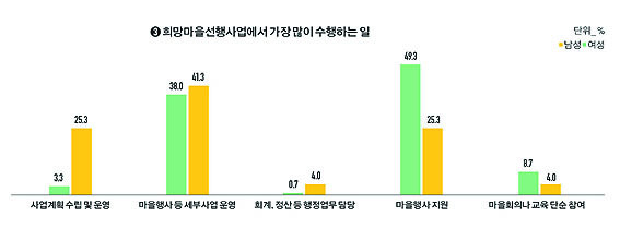 Ãæ³²ÀÇ ¸¶À»¸¸µé±â»ç¾÷¿¡ Âü¿©ÇÑ ¿©¼º¸®´õµéÀÌ ¸¶À»Çà»çÀÇ ´Ü¼øÁö¿ø ºñÁß(49.3%)ÀÌ ³ôÀº °ÍÀ¸·Î ³ªÅ¸³ª, ¿©¼ºÀÇ ½ÇÁúÀûÀÎ Âü¿©È°¼ºÈ¿Í ´ëÇ¥¼º Á¦°í°¡ ÇÊ¿äÇÏ´Ù´Â ÁÖÀåÀÌ Á¦±âµÆ´Ù.