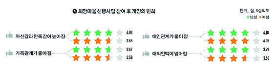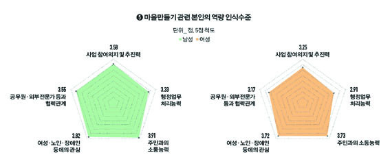 ¶ÇÇÑ ÀÌ·¯ÇÑ ¿ªÇÒ ºÐ´ã °á°ú, ¿©¼ºÀÌ ¸¶À»¸¸µé±â¿¡ Âü¿©ÇÑ´Ù°í ÇØµµ Àڽۨ°ú ¸¸Á·°¨À» °¡Áö±â ¾î·Á¿î »óȲÀ¸·Î, »ç¾÷ Âü¿©·Î ÀÎÇÑ °³ÀÎÀÇ º¯È¸¦ ¹¯´Â Áú¹®¿¡¼ ¿©¼ºµéÀº ¸¸Á·°¨¡¤Àڽۨ(¿©¼º 3.65Á¡, ³²¼º 4.03Á¡), ÇàÁ¤¡¤Àü¹®°¡¿ÍÀÇ °ü°è(¿©¼º 3.60Á¡, ³²¼º 3.99Á¡)¿¡¼ ³·Àº ¸¸Á·µµ°¡ ³ª¿Ô´Ù.