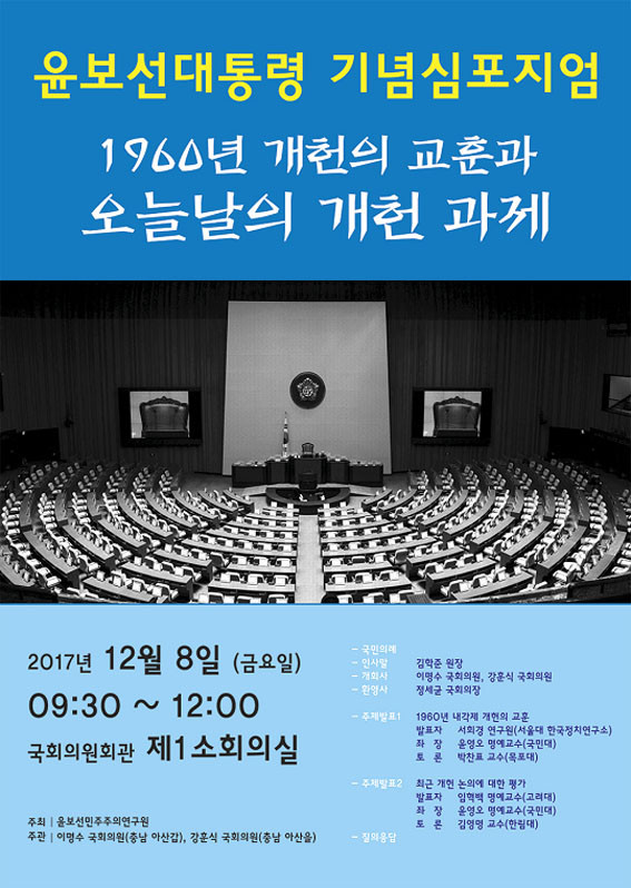 À±º¸¼±¹ÎÁÖÁÖÀÇ¿¬±¸¿ø(¿øÀå ±èÇÐÁØ)ÀÌ ÁÖÃÖÇϰí À̸í¼ö¡¤°ÈÆ½Ä ±¹È¸ÀÇ¿øÀÌ ÁÖ°üÇÏ´Â À±º¸¼±´ëÅë·É ±â³ä½ÉÆ÷Áö¾ö ¹× ÇмúȸÀǰ¡ 12¿ù 8ÀÏ ¿©Àǵµ ±¹È¸ÀÇ¿øÈ¸°ü¿¡¼ °³ÃֵȴÙ.