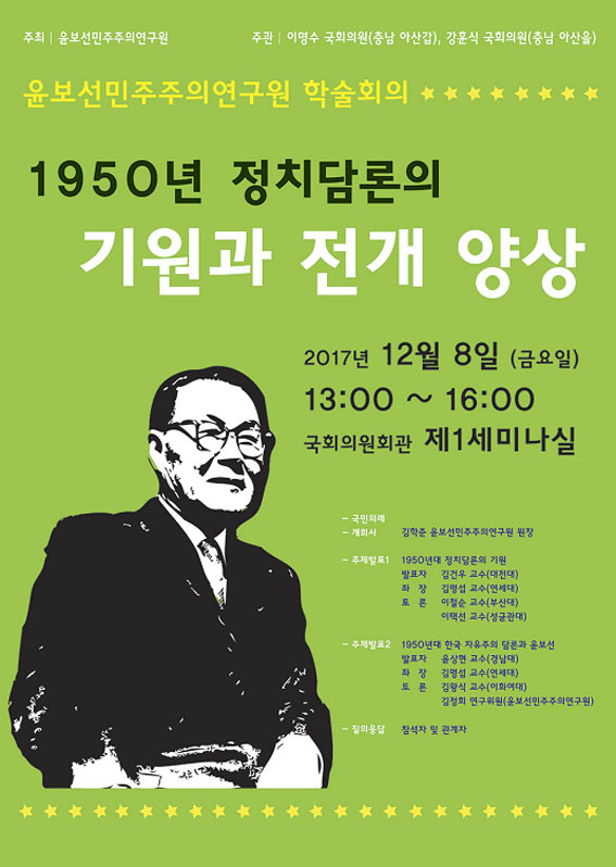 ±è°Ç¿ì ±³¼ö´Â ÁÖÁ¦¹ßÇ¥¿¡¼ ¡°À±º¸¼±ÀÇ ¹ÎÁÖÈ ¿îµ¿ÀÇ 1950³â´ë Áß¹Ý ÀÌÈÄ ÀÚÀ¯´ç Á¤±Ç±â¿¡ Çѱ¹ ¾ß´ç°ú Áö½Ä»çȸ¿¡ Å« ¿µÇâÀ» ³¢Ä£ ¾îÁ¨´Ù ¡®Æ÷°ýÀû ±Ù´ëȷС¯ÀÇ ¿¬¼Ó¼±»ó¡±ÀÓÀ» ¹àÈ÷¸ç, À±»óÇö ±³¼ö´Â ÁÖÁ¦¹ßÇ¥¿¡¼ ¡°Çѱ¹ÀüÀï ÀÌÈÄ ÀÚÀ¯ÁÖÀÇÀû °æÇâÀÇ Â÷À̵é°ú Ư¡À» ±Ô¸íÇÏ¸ç ±× °úÁ¤¿¡¼ À±º¸¼± Á¤Ä¡´ã·ÐÀÇ ¼º°ÝÀ» ±Ô¸í¡±ÇÑ´Ù.
