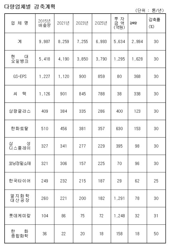 ÀÌµé ±â¾÷Àº Çù¾à¿¡ µû¶ó 2015³â ±âÁØ 9õ987ÅæÀÎ ´ë±â¿À¿°¹°ÁúÀ» 2021³â 8õ259ÅæÀ¸·Î 17%¸¦ ÁÙÀ̰í, 2025³â¿¡´Â 6õ993ÅæÀ¸·Î 30%¸¦ ÁÙÀ̱â·Î Çß´Ù.