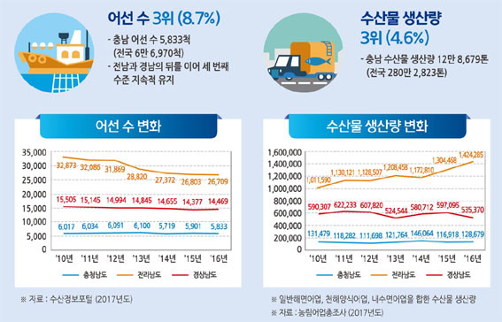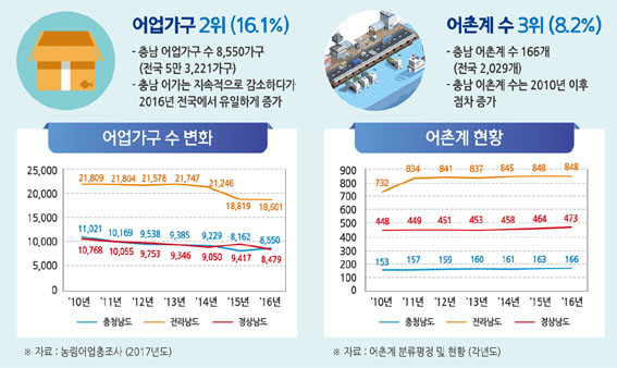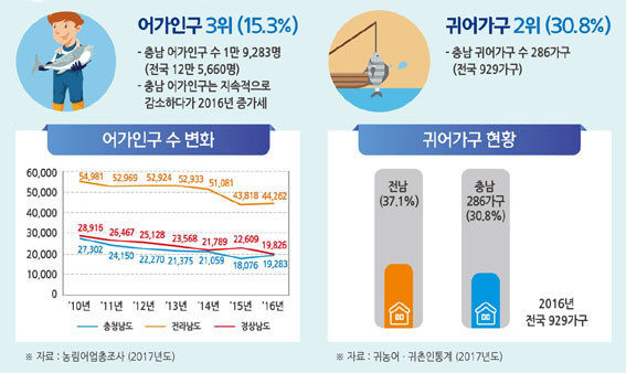 ƯÈ÷ Ãæ³² ¾î°¡Àα¸´Â 2016³â¿¡ 1¸¸ 9õ283¸í(Àü±¹ ´ëºñ 15.3%)À¸·Î ¾î¾÷°¡±¸¿Í ¸¶Âù°¡Áö·Î Áõ°¡¼¼¸¦ º¸¿´´Ù. ±×¸®°í Àü±¹ ±Í¾î°¡±¸ 929°¡±¸ Áß Ãæ³²Àº Àü³²(37.1%)¿¡ ÀÌ¾î µÎ ¹øÂ°·Î ¸¹Àº 286°¡±¸(30.8%)·Î ³ªÅ¸³ª °í¹«ÀûÀ̾ú´Ù.